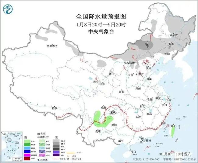 具体预报如下:1月7日20时至8日20时,内蒙古东北部、黑龙江、新疆北部高海拔山区、西藏东部、青海东南部、川西高原北部、贵州西北部、云南东北部等地部分地区有小到中雪或雨夹雪。四川南部、贵州西南部、云南中东部和西南部、台湾岛东部等地部分地区有小雨。内蒙古中西部、新疆北部和东部、辽东半岛、山东半岛等地部分地区有4~6级风,阵风7~8级。南海西南部海域将有7~8级、阵风9级的东北风。