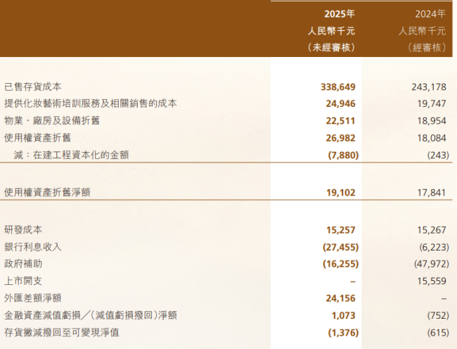 数据显示,2021年至2024年,毛戈平的研发成本分别为1370.3万元、1454.8万元、2397.5万元、3231.1万元,研发费用率分别为0.87%、0.8%、0.83%和0.83%,2025年上半年,毛戈平的研发成本为1525.7万元,较去年同期的1526.7万元略有下降,研发占比仅为0.58%,多年来该项数据均低于1%。这一数字与同行业上市公司2%-3%的平均研发费用率相比,有一定差距。