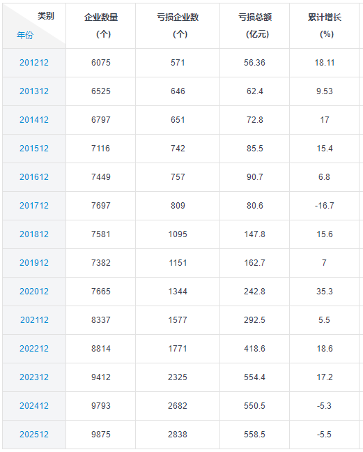 医药行业亏损企业增多。根据中商产业研究院相关数据,至2025年12月,亏损企业数达到2838家,亏损面达到药企数量9875家的28.74%,较2024年同期亏损企业数2682家增加156家、亏损面27.41%扩大1.33个百分点;从亏损额来看,亏损总额558.5亿元,较2024年同期亏损额550.5亿元扩大5.5%。