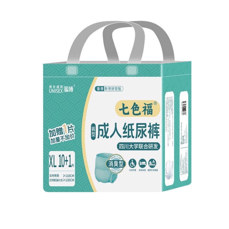同时,七色福产品均采用绵柔亲肤的无纺布表层,搭配透气不透水的底膜,既呵护老人脆弱的肌肤,又能有效避免长期穿戴带来的闷热感。双重立体防漏隔边和弹性腿围的设计,让产品能紧密贴合身体,不管是卧床静养还是小幅活动,都能有效防漏。而消臭高分子的灵活应用,更是解决了传统成人护理产品的异味难题,不仅让照护环境更舒适,更守护了老年群体的个人尊严。