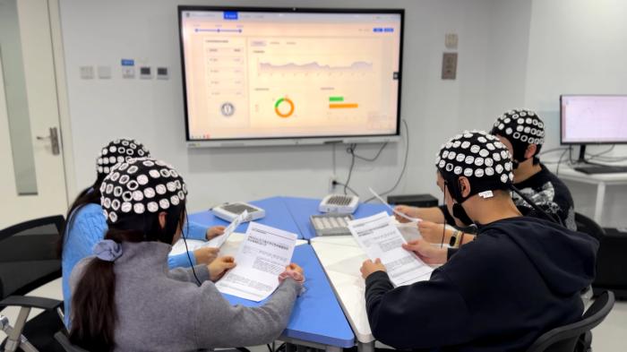 天津大学研究人员正在使用新研发的“软梳电极”,开展多人脑电超扫描实验。天津大学供图