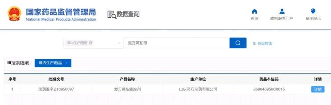 复方黄柏液涂剂2016年被认定为“国家二级中药保护品种”,保护期至2030年7月。这意味着在长达14年的时间里,其他企业依法不得生产相同药品,也就是说,复方黄柏液的生产商只有汉方制药。蓝鲸记者通过查询国家药监局官网也发现,复方黄柏液涂剂只有山东汉方制药有限公司一家生产。
