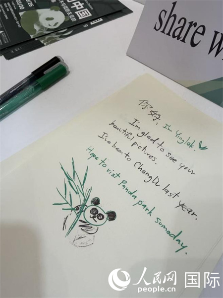 图片展现场的观众留言册上,海外民众积极评论打卡并画下了生动活泼的熊猫手绘。 人民网记者 张矜若摄