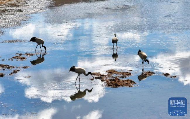 近日,北返迁徙的黑颈鹤在四川省红原县的草原上觅食。这些优雅的鸟类以其独特的姿态和高亢的叫声成为草原上的一道亮丽风景线。3月29日,人们在嘎曲河红原县月亮湾段观察到黑颈鹤正在觅食