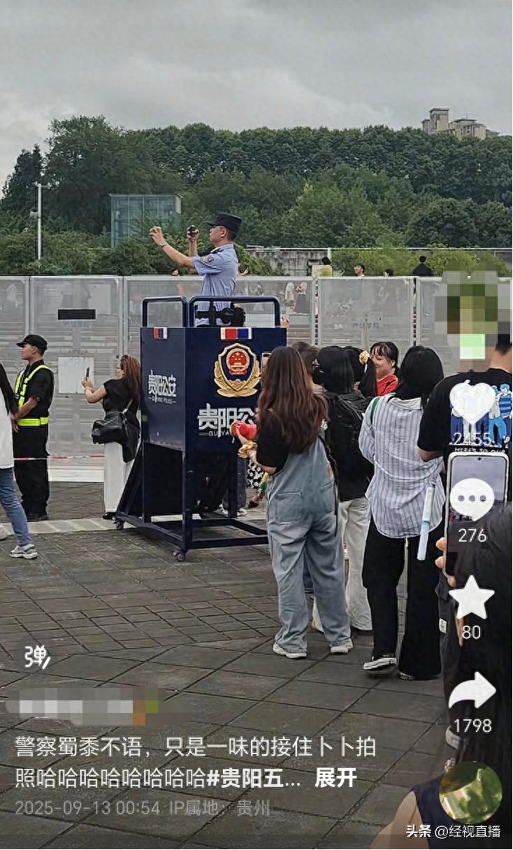 9月12日晚,五月天“回到那一天”25周年巡回演唱会贵阳站首场开唱。进场前,有网友发现,场外贵阳公安值班点前有不少粉丝排队等待民警代拍打卡。视频显示,值班民警站在高处,一一拿起粉丝手中的手机和应援胡萝卜玩偶“卜卜”,帮其拍照打卡。“警察蜀黍...