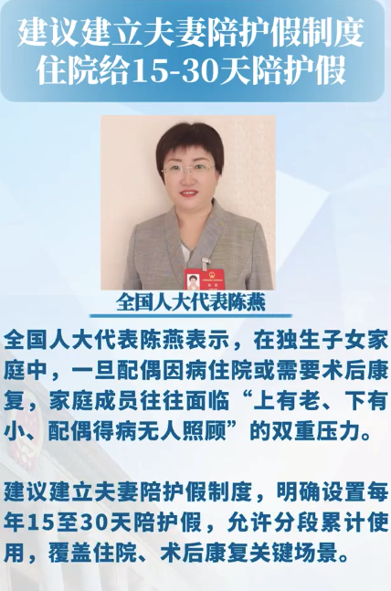 全国人大代表陈燕对记者表示,在现行休假体系中,针对夫妻间的专项陪护制度仍属空白。尤其在独生子女家庭中,一旦配偶因病住院或需要术后康复,家庭成员往往面临“上有老、下有小、配偶得病无人照顾”的双重压力。建议建立夫妻陪护假制度,明确设置每年15至...