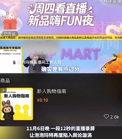 11月6日晚,泡泡玛特一段12秒的直播录屏在网络流传。视频显示,当晚23:35,泡泡玛特泡泡抽盒机小程序直播间内,直播结束后,画面未及时切断,一名女工作人员手持品牌挂链直言“妈呀,这东西卖79元确实是有点过分了”,身旁男同事则回应“没事,会...