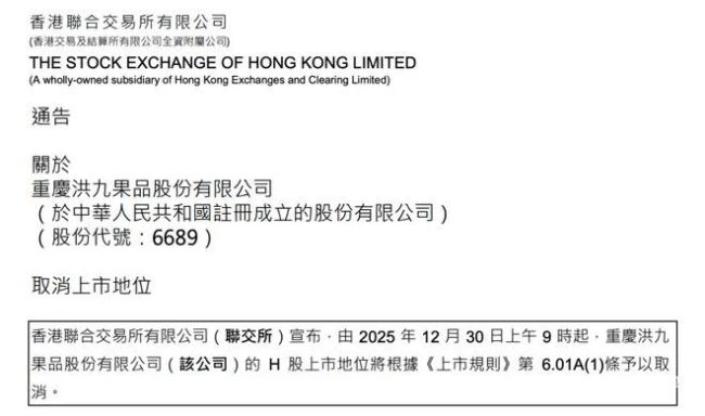因无法按时披露财报,停牌超过一年半的“水果第一股”洪九果品(06689.HK)迎来退市终局。