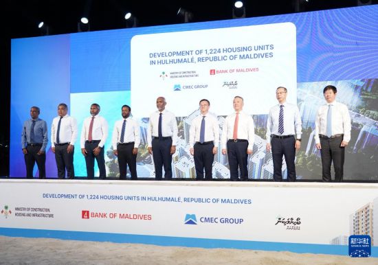 3月21日,马尔代夫总统穆伊兹(中)在胡鲁马累出席由中企承建的马尔代夫保障性住房项目开工仪式。 由中国企业承建的马尔代夫保障性住房项目3月21日晚在胡鲁马累举行开工仪式,马总统穆伊兹、多名内