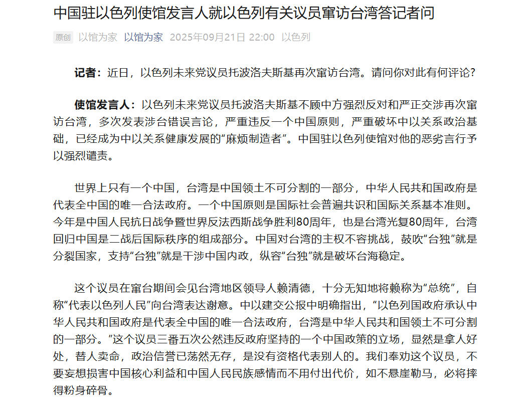 中国驻以色列大使馆微信公众号发布消息,回应了以色列未来党议员托波洛夫斯基窜访台湾的问题。发言人指出,该议员不顾中方强烈反对和严正交涉再次访问台湾,并多次发表错误言论,严重违反一个中国原则,破坏中以关系的政治基础,成为两国关系健康发展的障碍