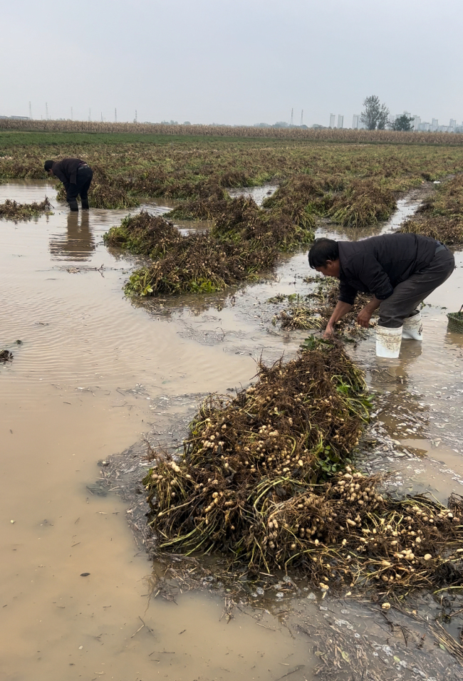 林涵艰难地在泥泞中薅着地里的花生。过去一个多月,她和丈夫早出晚归,希望能尽快将几十亩花生收上来,但9月接连不断的阴雨让他们一筹莫展。林涵形容这些日子,早上出门还算干净,薅到天黑,眼镜糊了,人也糊了,“干不到头,一抬头还有那么多地搁着”