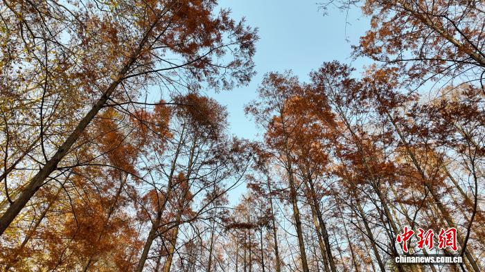 12月1日,位于河南郑州黄河迎宾馆的水杉林一片绯红,层林尽染,成为冬日里“美拉德”色系的别致风景。图为多彩斑斓的初冬树林。赵梦阳 摄