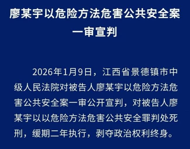 1月9日,景德镇中院对“景德镇一家三口被撞身亡案”进行了宣判。被告人廖某宇因以危险方法危害公共安全罪被判处死刑,缓期二年执行,剥夺政治权利终身