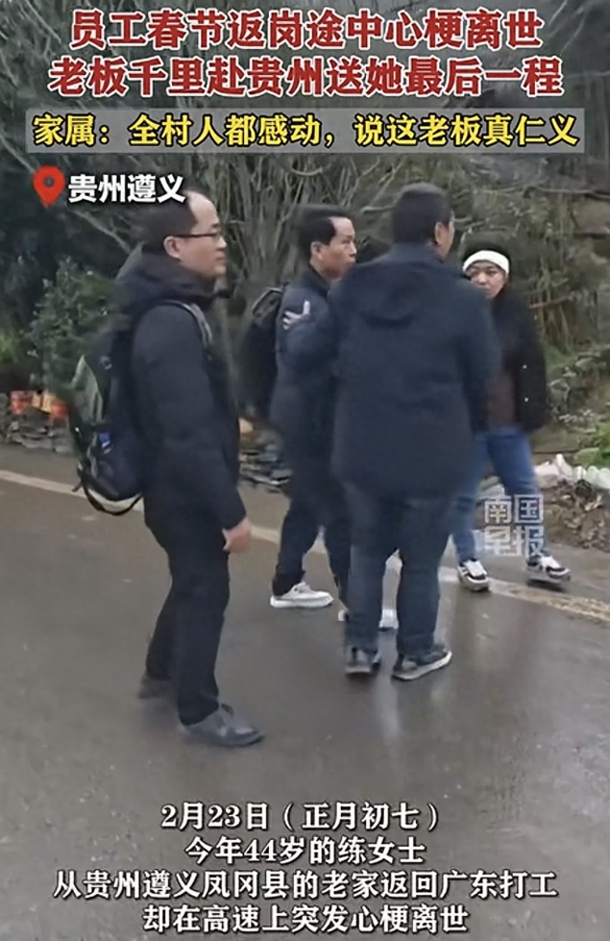 近日,贵州一名44岁的练女士在春节后从老家返回广东打工途中不幸突发心梗去世。她在高速公路上突然发病,最终未能挽回生命。出殡前,练女士所在的工厂老板和员工特意乘坐飞机并包车赶到了她的家乡,为她送行。练女士的家属表示,医生诊断为心肌梗死